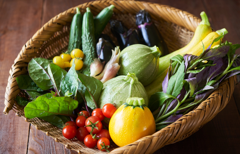 富士山の流水を使用した野菜や特産品の果物・山梨ブランドの魚や甲州牛。